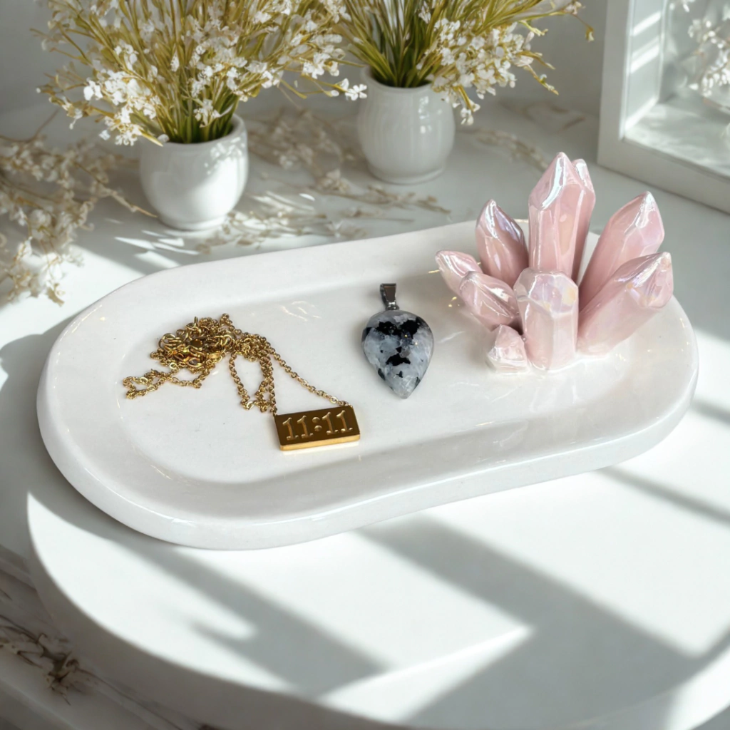 Nuestra línea de cerámicas está pensada y diseñada con el propósito de ser un objeto valioso para tu hogar, tu lugar de trabajo y tus rituales. En este caso te presentamos a nuestro Alhajero Cuarzo Rosa.